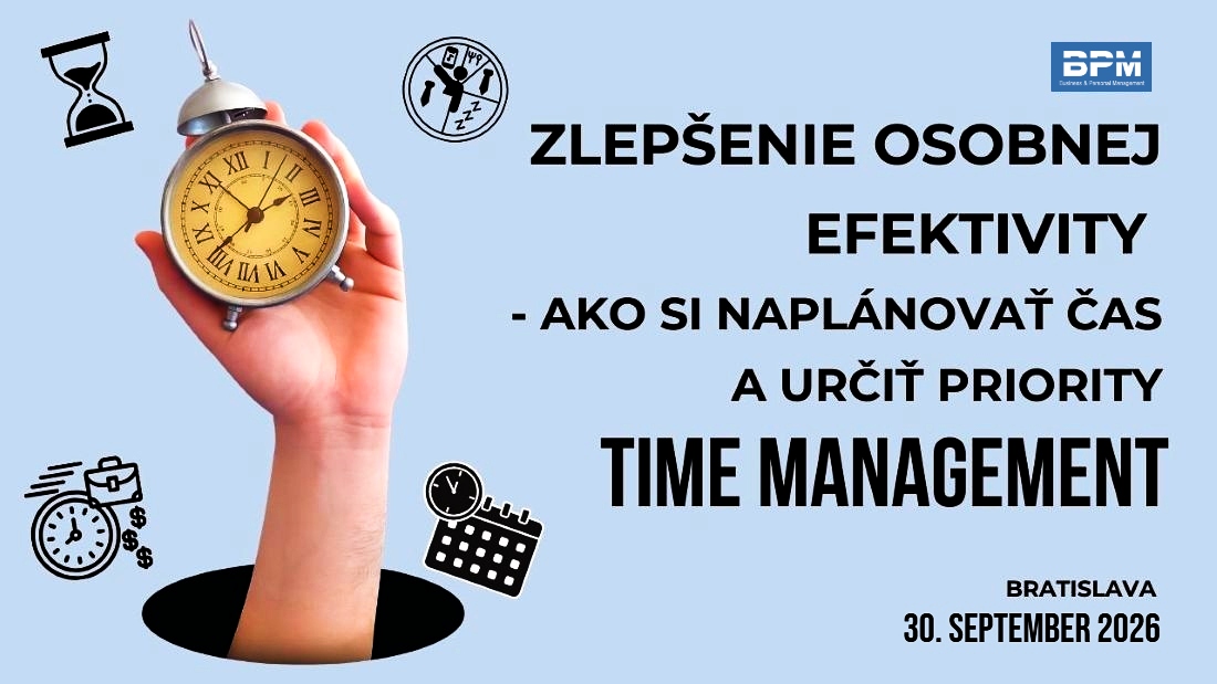 30.09.2026 - 30.09.2026 Zlepšenie osobnej efektivity - ako si naplánovať čas a určiť priority - Time Management Kvalifikovaný odborník a skúsený lektor Bratislava 246,00 Eur