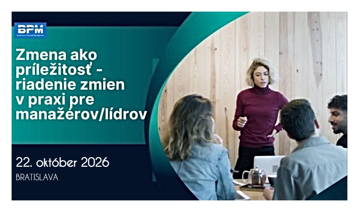 22.10.2026 - 22.10.2026 Zmena ako príležitosť - riadenie zmien v praxi pre manažérov/lídrov Kvalifikovaný a skúsený lektor Bratislava 295,20 Eur