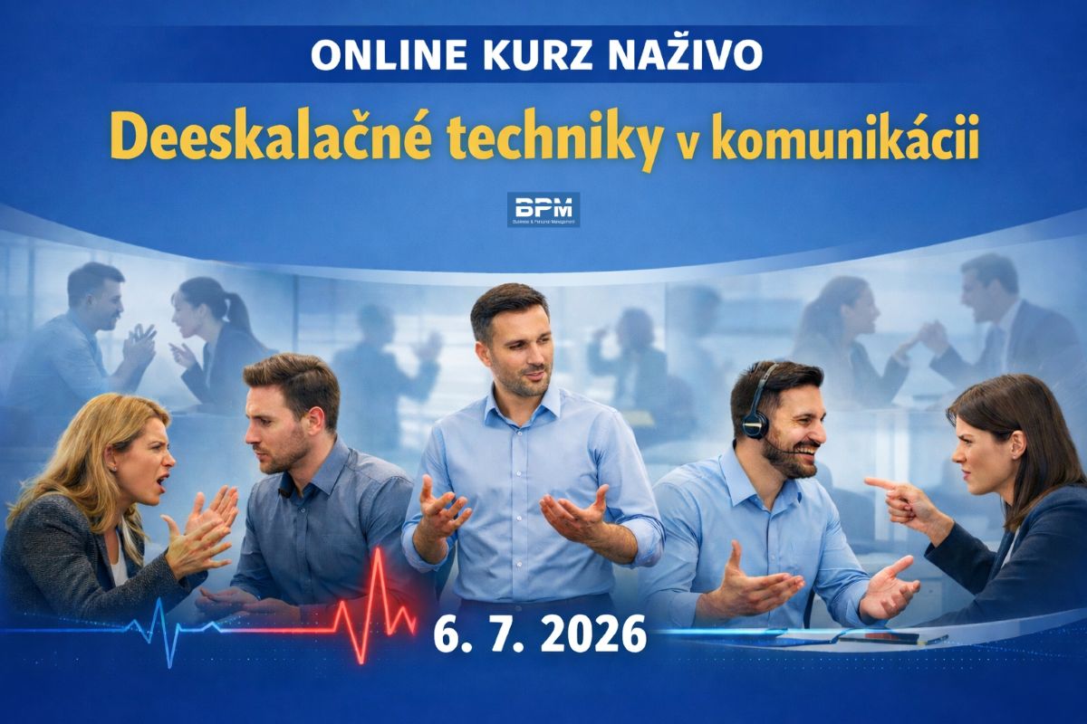06.07.2026 - 06.07.2026 ONLINE KURZ NAŽIVO Deeskalačné techniky v komunikácii - ako deeskalovať a zvládnuť napätú situáciu na pracovisku (s kolegami a zákazníkmi) Ing. Ľubica Karetková Naživo ONLINE 184,50 Eur