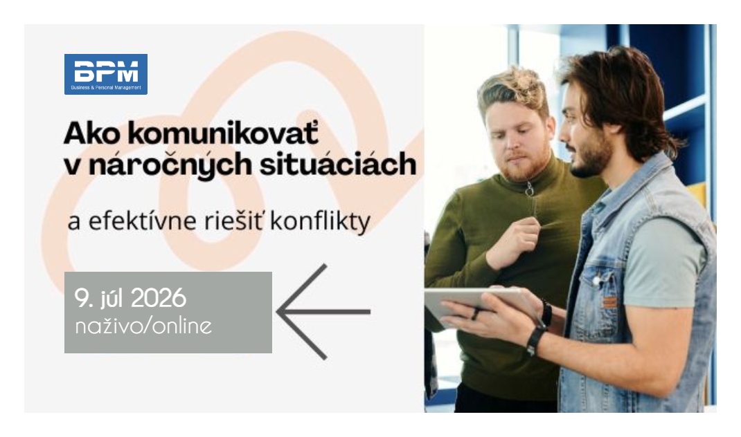 09.07.2026 - 09.07.2026 ONLINE KURZ NAŽIVO Ako komunikovať v náročných situáciách a efektívne zvládať konflikty Ing. Ľubica Karetková Naživo ONLINE 175,00 Eur